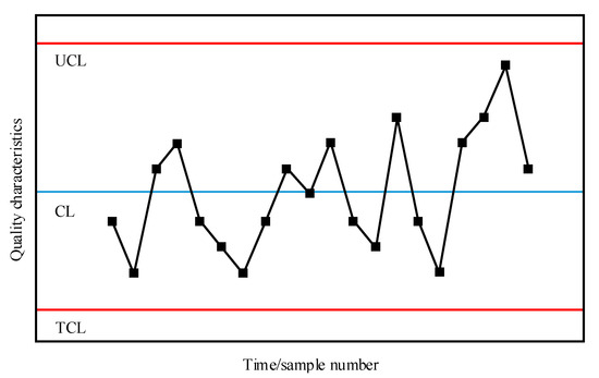 Figure 1 is the structure diagram of the X control chart, in which abscissa represents time series or sample series and ordinate represents water quality characteristics; UCL, Cl, and TCL represent the upper control limit line, center line, and lower control limit line, respectively; and the mean value of water quality characteristics in a given time interval is taken as the center line of water quality control. If the water quality characteristics of a certain point are higher or lower than three times the standard deviation, it is beyond two control limits. The range of the limit line is considered to be abnormal.