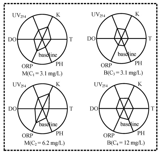 In the same ocean pollution model, the objects of the same category have similar characteristics. Taking heavy metal polluted water and phenol aniline polluted water as examples, the six-parameter model of water quality is analyzed, as shown in Figure 3, where B and M represent phenol aniline pollutants and heavy metal pollutants, respectively. It is obvious from Figure 3 that the response of different characteristic parameters in water body to different types of pollution is different, so the six-parameter characteristic shapes of different types of pollutants are quite different; meanwhile, the six-parameter characteristic shapes of the same type of pollutants at different concentrations are similar. In this study, the characteristics of marine water quality are expressed in vector form; that is, X = (K, T, pH, ORP, DO, UV254). From Figure 3, it can be seen that the water quality characteristic vectors of different pollution types have different performance.