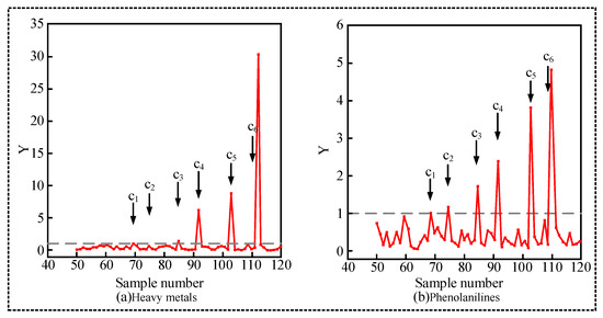 In order to judge the validity of the polygon area method, heavy metal pollutants and phenol aniline pollutants with a concentration of c1–c6 were added to the water with serial numbers of 70, 74, 86, 92, 103, and 111, respectively, and the abnormal water quality was detected. The concentrations of heavy metal pollutants corresponding to c1~c6 were 0.6, 1.2, 3.5, 7.0, 10.5, and 14.0mg/L, respectively. The concentrations of phenol and aniline were 1.3, 2.4, 6.0, 12.0, 18.0, and 24.0mg/L, respectively. Figure 5 is a broken line diagram of water quality Anomaly Index Y, in which the dotted line is Y = 1, (a) heavy metal pollutants, (b) phenol and aniline pollutants.