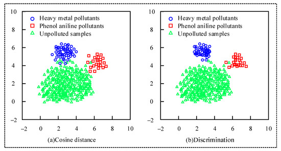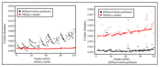 In Figure 6, (a) represents the classification effect of heavy metal polluted water samples, and (b) represents phenol and aniline pollutants. It can be seen from Figure 6a that the classification effect of some water samples is not obvious, and the K-means model has the phenomenon of misclassification in the classification of heavy metal pollutants; in Figure 6b, cosine distance is obviously better than heavy metal pollutants in the recognition and classification effect of phenol aniline pollutants, but there are still some sample recognition errors.