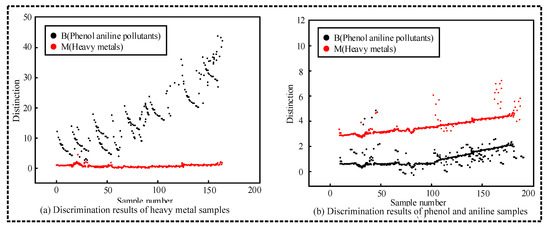 Figure 7 shows the classification results of different pollutant samples, in which the black dots represent phenol and aniline, and the red dots represent heavy metals. Figure 7a shows the discrimination results of heavy metal samples. It can be seen from Figure 7a that the red dots of heavy metals are mostly below two, while the black dots of phenol and aniline are above four. Figure 7b shows the discrimination results of phenol and aniline samples. As can be seen from Figure 7b, most of the black spots are below two, while the red spots are obviously above three.