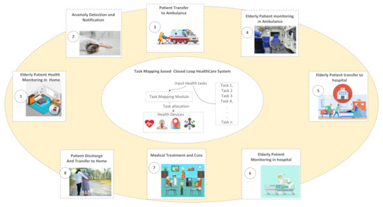 A conceptual diagram of the proposed E-PHMS in a closed-loop healthcare environment is given in Figure 1. An elderly patient is monitored in three scenarios, smart home, smart ambulance, and smart hospital. E-PHMS is designed with alarming threshold profiles to detect and notify anomalies in the vital signs to healthcare authorities. If a patient outbreak is detected in the smart home, the patient is transferred to a smart ambulance environment and monitored through the proposed E-PHMS. In the smart ambulance, patient vital signs are continuously monitored and visualized on the hospital’s emergency dashboard. Once the elderly patient is hospitalized to the intensive care unit (ICU), the system monitors the vital signs and provides descriptive and predictive analysis on the patient data. When elderly patients’ health conditions are recovered, they are discharged and transferred to the smart home and monitored continuously. The system’s data is used for data analysis, such as anomalous behavior detection and notification.