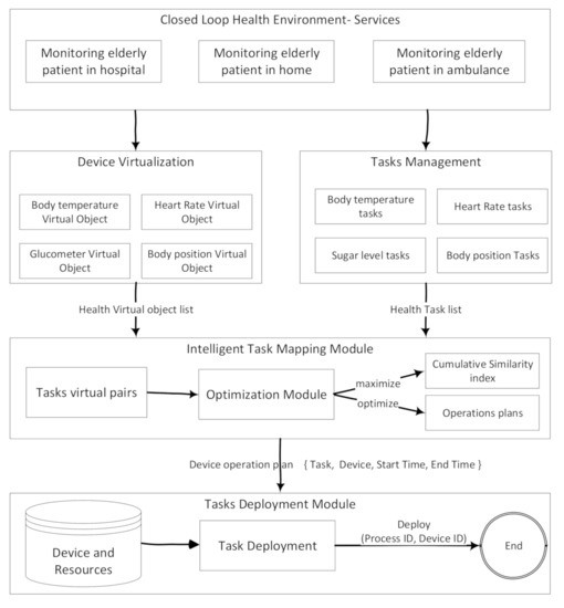Health tasks are defined based on the generated task suggestions from the microservice analyzer component. Health tasks are functional units of health microservices. Health monitoring devices are the biomedical sensors used for monitoring patients. Health devices are virtualized into virtual objects using the virtualization module of the system. Virtual objects are connected to biomedical sensing devices using an attribute of the virtual objects called Uniform Resource Identifier (URI). Task mapping component map health tasks on health devices based on the optimal order received from the proposed task mapping algorithm. The proposed task mapping algorithm uses objective optimizations based optimization approach to generate optimal devices operations plans. For ease of understanding the concept, the mapping component visualizes the results task mapping algorithm in a mapping window, showing a visual connection between virtual objects and health tasks. Finally, device operations plans are used to create processes for execution on one or more biomedical sensors. The process of executing a health task on a health device is called health task deployment.