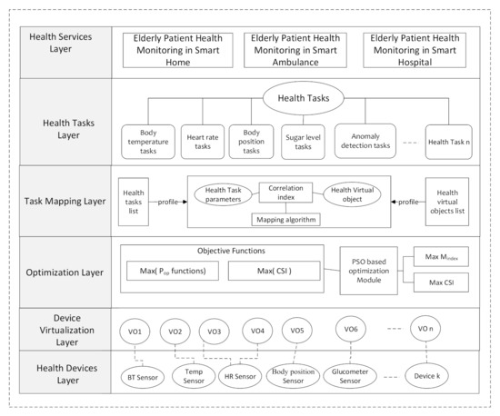 Micro-operations, also known as health tasks, are assigned to one or more virtual objects. A virtual object emulates the features and attributes of health monitoring devices. The health tasks layer provides task-level management of health monitoring microservices. The tasks Mapping (IM) layer provides a mechanism for generating tasks and virtual object pairs. The TM layer input health task attributes to task mapping algorithms to generate optimal ordered pairs of health tasks and virtual objects. The optimization layer provides optimization schemes to generates these ordered mapped pairs based on optimal health devices operation plans. Optimal health device operation plans are obtained by maximizing the objective function results. The ordered task mapping pairs are used to create processes. These processes are executed on health monitoring devices.