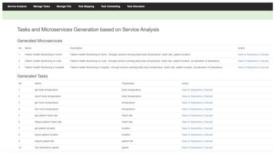 Figure 5 represents health task and microservices generation window that shows the visualization of the health tasks suggestion based on the microservice analyzer component. Three microservices of patient health monitoring along with ten health tasks are generated by the microservice analyzer component using the service description. The automated suggested tasks and microservices can be saved to the repository or discarded. However, the application also provides manual addition of tasks and microservices. Health tasks and microservices are generated based on the description of the services needed by the health authorities. E-PHMS application uses natural language processing (NLP) library NLTK. E-PHMS application is scalable to other health microservices and tasks using a manual approach. Microservice and health task forms are used for manual entry. Apart from adding new microservices, existing microservices and tasks can be removed or edited using the E-PHMS application dashboard. The save to repository option is used to save tasks and microservices permanently in the database. MySql was used as a database server; however, any alternative database can be used. Manage tasks menu is used for tasks profile management, whereas manage VOs menu is used for device virtualization and device profile management. Tasks allocated on devices can be accessed through the "task allocation" menu. The proposed task mapping algorithm generates devices and health tasks operations plans for the generated tasks and virtual objects. An optimal device operation plan results in an optimal ordered list of tasks virtual object pairs. An optimal devices operation plan is selected for task allocation on the sensing device to maximize the time until which a task can be delayed and minimize the delay for a task that needs to be executed first. For task allocation, the system creates processes from the device operation plan. The process is deployed on the IoT device using the URI. As discussed above, the IoT server registry contains information on all health sensors and actuators. For example, the URI of the device contains the ID and a message. IoT server parses this message using the decoded mechanism to deploy the process on the device.