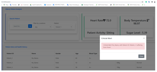 For instance, the body temperature, heart rate, body position, and blood glucose level tasks are visualized in the figure. Once an anomaly is detected in the results from task execution based on the threshold-based method, it is notified using dialogue alert, alarm, and call alert. Anomaly detection based on the body temperature data is shown in the figures. The dialogue shows the notification of a patient suffering from fever. Anomaly detection based on the health sensing data is discussed in detail in the results and discussion sections.