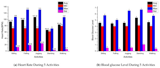 Heart rate, body temperature, and blood glucose level are essential human body traits to identify normal and abnormal health conditions. Figure 7a represents the average, minimum, maximum, and standard deviation of heart rate data collected during the subjects’ activities. Figure 7b represents the average, minimum, maximum, and standard deviation of blood glucose level data collected during the subjects’ activities.