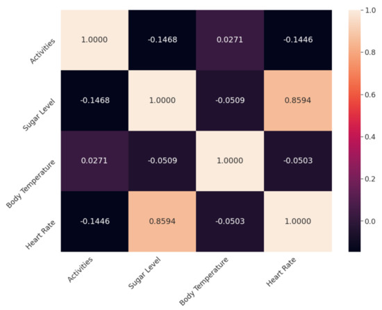 The dataset produced from the E-PHMS contains 1440 instances. The data set contains 5 data features, time, body temperature, heart rate, activity, and blood glucose level of the E-PHMS users. Figure 8 presents correlation analysis between the features of the prepared dataset.