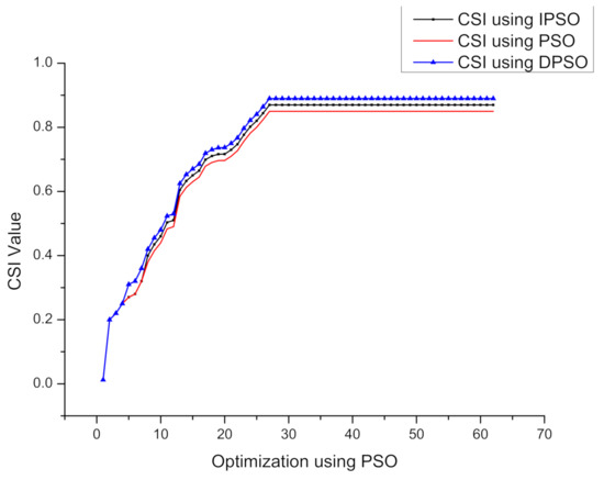 function provides a value based on device operation plans to use the resources in such a manner that delayable time of devices operation is maximized. The value is directly proportional to delayable time, the maximum the value, the maximum is the delayable time, and minimum the value, the minimum is the delayable time. Results of objective function using DPSO is more optimized than traditional PSO and IPSO. Figure 10 shows the CSI objective function results based on PSO, IPSO, and DPSO are presented. As explained earlier, CSI is the correlation between a set of devices, and maximum CSI means the device sets are related, and the operational plans based on these devices will lead to flexible task mapping plans, minimum idle time, and maximum delayable time. The value is directly proportional to CSI value. The highest CSI value is achieved based on the maximum value. Results of the CSI objective function are compared using three versions of PSO. DPSO is more optimized as compared to traditional PSO and IPSO approaches.