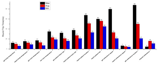 The performance analysis of the proposed E-PHMS based on an intelligent task mapping approach is evaluated using metrics such as round-trip time, reliability, and network Latency. The round-trip time is the total time E-PHMS takes from health task generation to process execution on health devices and respond back from health devices to E-PHMS. Health tasks for 30 volunteers were deployed, and the round-trip time based on the log system of E-PHMS were recorded for analysis. From these 30 subjects’ data, aggregation functions such as minimum, maximum, and average of the round-trip time are calculated. Round trip time analysis of E-PHMS is presented in Figure 11. The round-trip time is measured in milliseconds.