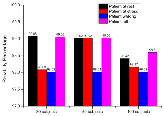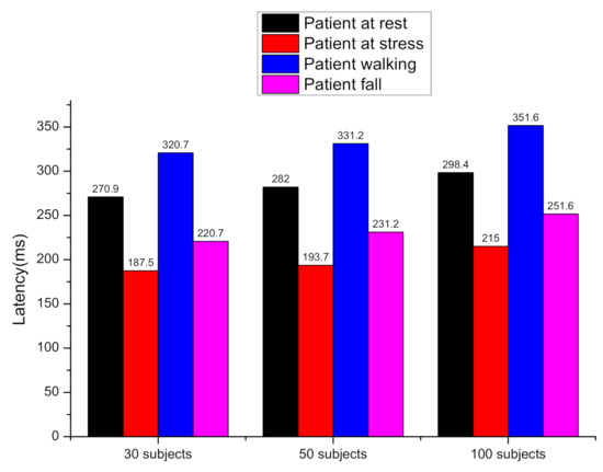 The system is evaluated using two types of subjects data, first with a real test using 30 volunteer subjects wearing the biomedical sensors and performing activities such as walking, sitting, standing, falling, and jogging. Other performance evaluation tests such as reliability, round trip time (RTT), and latency were conducted in a simulation environment for three sets of virtual patients of 30, 50 and 100 users. For the simulation of various user sets, the Locust load testing tool was used. Pox-based simulation of devices were used to investigate sensing devices failure effect on the response time. The devices were power off to induce device failure error. The experiment of 30 subjects has been done in the Mobile computing laboratory of the computer engineering department of Jeju National University, Jeju, South Korea. A total of 1440 data instances was recorded for different activities of these 30 subjects. Heart rate, body temperature, blood glucose level, and body position was recorded using wearable sensors. Statistical data of 30 subjects sensing data are presented in Table 7. The average heart rate recorded during the experiment is 73.4. Heart rate is calculated based on the number of times a heart beats in one minute. A healthy heart function is to supply the right amount of blood at the right rate for body activities. For example, running or walking fast will make the heart rate faster. The average body temperature recorded is 97.1, and the average blood glucose level recorded using a glucometer sensor is 5.61. Minimum, maximum, average, and standard deviation were used to statistically analyze the collected data.