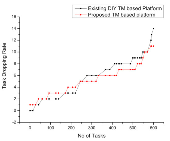 The first quantitative metric considered for the performance comparison of the proposed intelligent task mapping-based architecture with exiting DIY task mapping-based architectures is stability in peak load time. The stability of the architecture is evaluated based on the task dropping rate. A lesser rate of tasks dropping in peak load time means the system is more stable and reliable. Tasks dropping-based comparison analysis is presented in Figure 15. The figure shows that as the task load increases, the rate of tasks dropping increases, and vice versa. It is evident from the rate of tasks dropping increase, although the number of tasks drop is small for the DIY task mapping-based approach for small tasks load. However, for more tasks load intelligent task mapping-based architecture’s drop rate is steady.