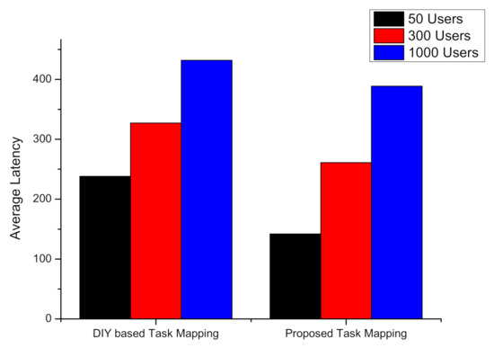 The third quantitative metric considered for the performance comparison of the proposed intelligent task mapping-based architecture with existing DIY task mapping-based architecture is the latency of tasks deployment. The comparison shown in Figure 17 is made using Locust, an open-source tool for three sets of virtual users. The average latency of DIY task mapping-based architecture for 50, 300 and 1000 users are 238 ms, 327 ms, and 432 ms. The average latency of the proposed intelligent task mapping-based architecture for 50, 300 and 1000 users are 238 ms, 327 ms and 432 ms.