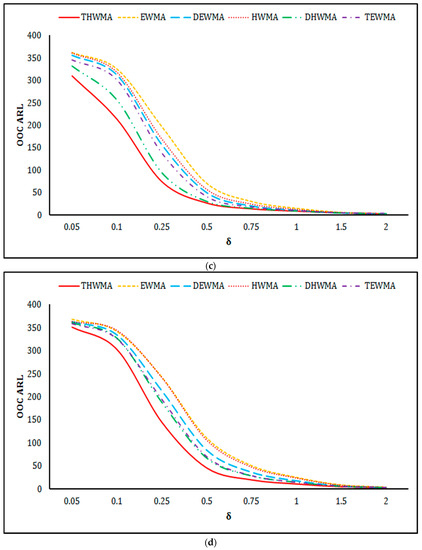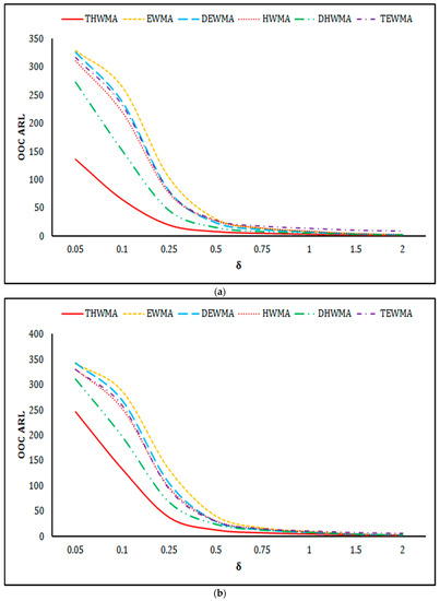 3.2. Comparison of the Proposed THWMA Chart with Existing Competitors