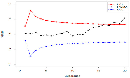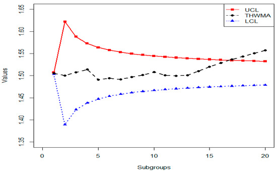 For implementation purposes in this section, the proposed THWMA chart along with HWMA and DHWMA charts are considered. For HWMA scheme design parameters and , for DHWMA chart design parameters and , and for the proposed THWMA model design parameters and are taken into account at the desired IC for all the charts. The graphical presentations of the proposed and existing counterparts are presented in Figure 4, Figure 5 and Figure 6. The HWMA and DHWMA charts trace an upward trend at sample number 18 (cf. Figure 4 and Figure 5) and the proposed THWMA scheme triggers the shift at the 17th sample point (cf. Figure 6). This illustrative section narrates that the proposed THWMA chart has a higher detection ability than its competitors in identifying shifts.
