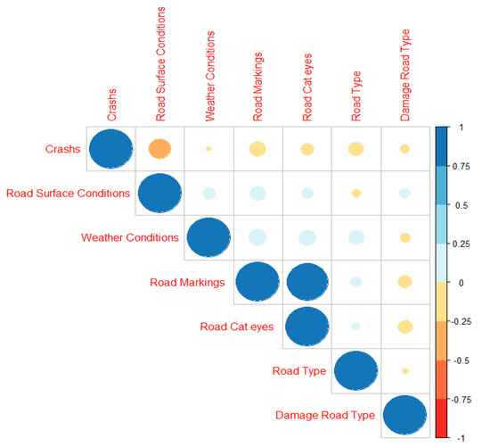 Hence, all of the values of explanatory variables were converted into indexed values. Further, the Pearson correlation among all variables is estimated, and the plot is presented in Figure 2. It is noted that all the explanatory variables have a negative relation with the number of crashes. The road surface condition is highly correlated, weather conditions are weakly correlated, and all other variables have a mild correlation with the number of crashes.