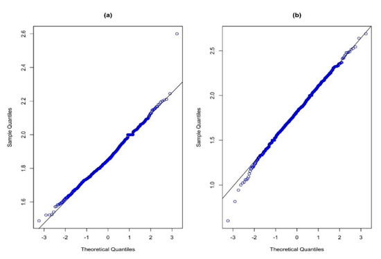 For the development of the control chart setup, we have considered the above-mentioned IC model. Further, using the normal probability plots plotted in Figure 4, it is observed that the IVRT is a normally distributed variable with a mean of 1.86 and variance of 0.017 (cf. Figure 4a). Similarly, the road surface conditions also follow a normal distribution, having a mean of 1.81 and variance of 0.08 (cf. Figure 4b). Hence, based on these estimates and following Section 4.1, we have set up the simulation settings of the COM–Poisson model, and control charting constants are obtained using the algorithm given in Section 4.1, and are reported in Table 7. It is noted that we have assumed , , and .