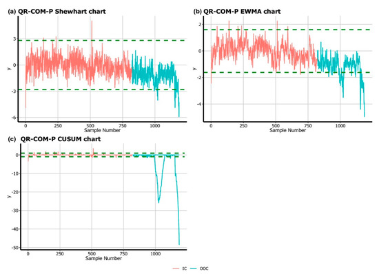 It is observed from Figure 5 and Figure 6 that the QR-COM–P Shewhart chart signaled four false alarms with 26 OOC points, while the same number of signals is detected by the DR-COM–P Shewhart chart. The QR-COM–P EWMA and DR-COM–P EWMA charts show 13 and 14 false alarms, while 76 and 80 OOC signals are reported by QR-COM–P EWMA and DR-COM–P EWMA charts, respectively. Further, 22 and 23 false alarms are reported by the QR-COM–P CUSUM and DR-COM–P CUSUM charts, respectively, while 124 and 126 OOC points are signaled by the QR-COM–P CUSUM and DR-COM–P CUSUM charts, respectively.