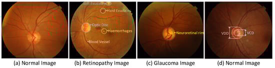 Retina image detection assists ophthalmologists in diagnosing different eye diseases, such as diabetic retinopathy, glaucoma, age-related macular degeneration and other diseases [], among which diabetic retinopathy is the main cause of blindness. The condition of retinal blood vessels (slope, curvature, neovascularization, etc.) is an important indicator for diagnosing retinal diseases. The fundus image structure of the diseased retina includes microaneurysms, hemorrhage and exudates, etc. [], referring to Figure 1b. In clinical testing of glaucoma, the vertical cup-to-disk ratio (CDR) is usually calculated to diagnose whether it is glaucoma []. CDR is the vertical cup diameter (VCD) divided by the vertical disk diameter (VDD). The normal CDR range is from 0.3 to 0.4. If the CDR is larger, it may indicate glaucoma or other ophthalmic neurological diseases, referring to Figure 1c,d.