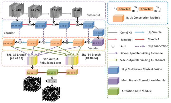 First, SRL periodically rearranges the information in the four-layer feature maps (L1, L2, L3, L4) of the decoded path. The height and width of the feature map are expanded by upsampling factors (1, 2, 4, 8) to achieve the effect of reducing the number of channels and increasing the size of the feature map. The implementation process is shown in Algorithm 1. After the scale reconstruction of the feature map by SRL, the segmentation results and edge information of the reconstructed feature map are refined using and convolution operations. The SRL layer mainly performs eight and 16 specific channel convolutions on the four-layer output feature R of the MSMB-Net decoding path, which generates the corresponding SRL_32 branch and SRL_64 branch. After the feature map passes through the SRL, the SRL_32 branch and the SRL_64 branch apply two convolutions and a convolution to refine the feature information of its edges, which means that MSMB-Net achieve better segmentation accuracy.