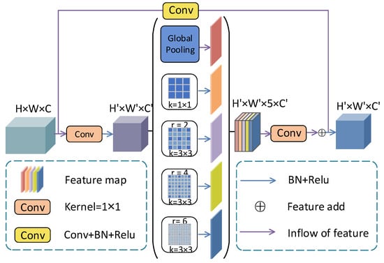 In the proposed framework, SMCF combines the advantages of DeepLabv3 [] and Res-Net [], as shown in Figure 3. DeepLabv3 and ResNet are two classic and representative architectures in deep learning. The structure of the DeepLab series uses different expansion rates to expand the receptive field of the model. Compared with the traditional convolution operation, the atrous convolution does not increase the number of parameters and maintains the same feature resolution. In addition, we introduce atrous convolution to improve the network’s ability to extract image features. Usually, pooling layers or convolutional layers with stride are used in the network structure for downsampling to expand the receptive field of the model. However, too many downsampling operations can cause the loss of feature information, which is not conducive to model learning and can increase the complexity of upsampling. To alleviate the above problem, let the network model keep the model receptive field constant or large while reducing the downsampling operation. We use artrous convolution [] instead of standard convolution to increase the perceptual field of the convolution kernel in MSMB-Net. ResNet uses a residual connection mechanism to avoid the bursting and elimination of gradients, which also accelerates network convergence. Mathematically, the calculation formula of the atrous convolution under the two-dimensional signal is (1)