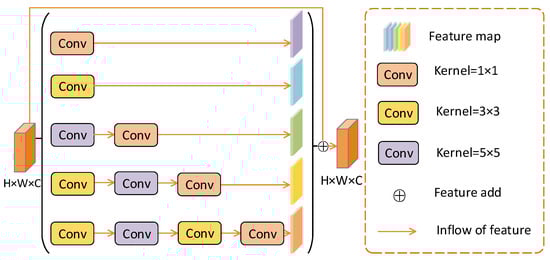 As shown in Figure 4, this mainly relies on combining multiple effective convolution kernels to detect targets of different sizes. Usually, the convolution of the large receptive field extracts the large target feature. The convolution of the small receptive field is more suitable for the recovery of small targets. The MBCM module has five cascaded branches. In each branch, convolution operations with different kernel sizes will obtain feature information maps of different sizes. In the last three branches, convolution is used to correct linear activation, which reduces the dimensionality and computational cost of weights. Finally, after feature transfer, the feature maps of the five branches are added to the original feature maps. This obtains a feature map of the same size as the original feature map.