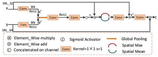 The attention module proposed in this paper is shown in Figure 6. First, the feature maps x and y of SRL_32 branch and SRL_64 branch are input to the attention module through the convolution layer. The corresponding feature vectors are obtained after global pooling. The gating coefficients are obtained by sigmoid activation. We used spatial maximization and spatial averaging for the feature maps. The feature maps obtained by spatial maximization and spatial averaging are concatenated. The feature maps obtained by concatenating have interdependent information with x. This allows the model to efficiently select more detailed information that needs attention. In this way, the spatial tolerance of the model is improved. Finally, and y are summed to obtain the final output feature z, which is used for pixel classification and improves the sensitivity of the channel features. The experimental results demonstrate that the attention module enables the MSMB-Net model to achieve higher specificity and accuracy.