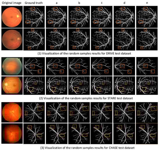 Figure 7 shows the comparison of the segmentation result images of each model on the DRIVE, STARE and CHASE datasets. In the figures, (1) shows the visualization results of random samples from the DRIVE test dataset, (2) shows the visualization results of random samples from STARE test dataset, and (3) shows the visualization results of random samples from the CHASE test dataset. The yellow boxes in the figure indicate that different network models have different effects on the local segmentation regions of the blood vessels. We can find some broken and mis-segmented vessel segments by zooming in on the yellow box. At the same time, it is observed that the combination of SMCF modules has a certain repair effect on the break of small blood vessels than the combination without these modules. In addition, from the segmentation results, the MSMB-Net model is more accurate for the segmentation of some small blood vessels.