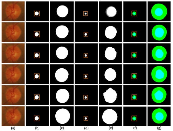 Comparison of segmentation images of each model in the Drishti-GS1 dataset. (a) Original image (b) Segmentation image of disc (c) Partial segmentation image of disc (d) Segmentation image of cup (e) Partial segmentation image of cup (f) Segmentation image of optic (g) Partial segmentation image of optic.