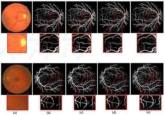 Manual detection of ocular diseases is usually a challenging and time-consuming task for ophthalmologists. The accurate acquisition of information in retinal images is used to assist ophthalmologists in detecting ocular diseases. Currently, a large number of scholars have worked on retinal image tissue segmentation. Y. Miao et al. [] proposed a retinal vessel extraction method using matched filtering and a local entropy threshold. Kundu et al. [] proposed a retinal vessel segmentation method, which creates a proportional space from the perspective of morphology. Palomera-Perez et al. [] proposed the segmentation of retinal vessels based on multi-scale feature extraction and region growth algorithms, but specialized knowledge is needed for the setting of vessel seed points and the formulation of termination rules. In [,,], the B-COSFIRE filter, the Gabor wavelet and Gaussian filter response are proposed for retinal vessel segmentation. These traditional machine learning methods do not have a strong ability to learn features automatically compared to deep learning methods, and the segmentation accuracy is not high. Jainish et al. [] proposed a retinal vessel extraction method based on the maximum entropy EM algorithm. The above literature uses an unsupervised method for the segmentation of retinal tissue. This method does not require reference to manual annotation and uses the default rules of blood vessels to specify the venous regions, since the unsupervised method suffers from the problems of not very good performance and generality caused by noise and pathological patterns.