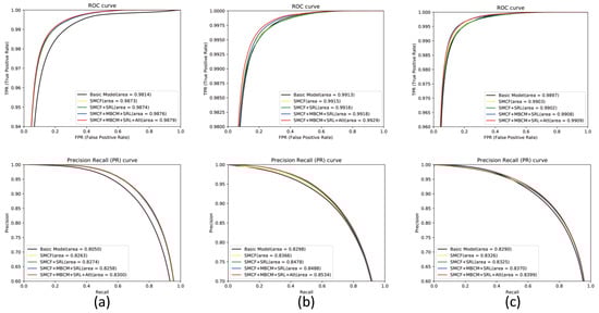 ROC plots and PR plots for each model on the DRIVE, STARE and CHASE datasets. (a) ROC curve and PR curve diagram of each model in the DRIVE dataset (b)ROC curve and PR curve diagram of each model in the STARE dataset (c) ROC curve and PR curve diagram of each model in the CHASE dataset.