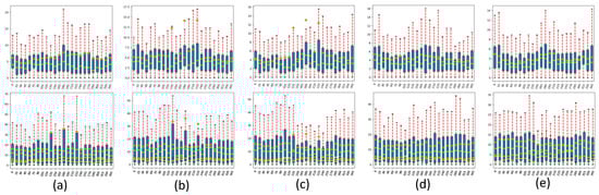 Box plot of BLE statistical values of each model in the Drishti-GS1 dataset. (a) Basic, (b) SMCF model, (c) SMCF+SRL, (d) SMCF+MBCM+SRL, (e) MSMB-Net.