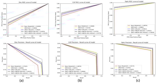 ROC curve and PR curve diagram of each model on the Drishti-GS1 dataset. Column (a) is the ROC curve and PR curve for each model on the Disc, column (b) is the ROC curve and PR curve for each model on the Cup, column (c) is the ROC curve and PR curve for each model on Optic.