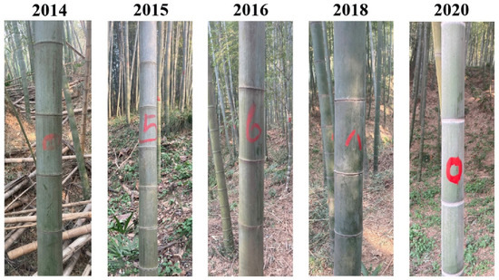 Every year some culms of bamboo shoots were marked by a water-resistant marker at every year, allowing reliable identification of the age of bamboo shoots (see Figure 1 for details). At the time of leaf sampling in early August 2020, there were five age groups of moso bamboo that had grown in 2014, 2015, 2016, 2018 and 2020. Years 2017 and 2019 were left out, because it was difficult to find bamboo culms developed in these years.