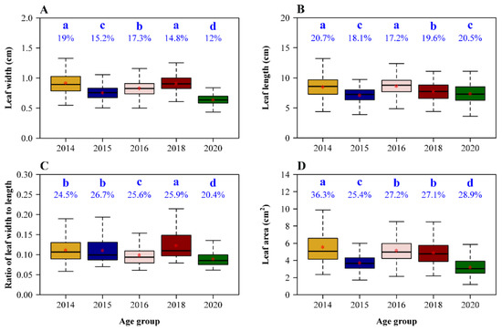 Mean leaf width (W), length (L), W/L ratio, and area differed among several plant age groups (Figure 2), but there was no clear relationship with plant age. Group 2014 had the largest leaf width, length, and area, but its mean W/L ratio was lower than that of group 2018. Although group 2016 had the second largest mean leaf width and area and the largest mean leaf length (having no significant difference with that of group 2014), its mean W/L ratio was the second smallest among the five age groups.