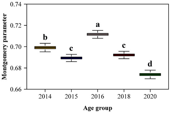 Comparison of the estimated Montgomery parameters (MP) among the five age groups of moso bamboo. The letters above the whiskers of the boxes were used to show the significance of the difference in the estimates of MP between any two age groups. The replicates of MP for each group were obtained using 4000 bootstrapping iterations.