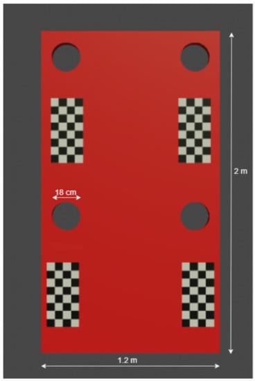 In the present project, a special target was designed. It consists of a red rectangle target with circular holes and four chessboard patterns, as represented in Figure 1. The red color was chosen because it is uncommon in nature. Therefore, the area of the rectangle can be easily identified from the image. The circular holes are used as a scale (their real size is 18 cm of diameter) since the circular shape is easy to identify and extrapolate precise measurements. The chessboard pattern is used for camera distortion calibration. The complete target is 1.2 m wide and 2 m high, being sufficiently large to be easily detected and measured with precision in the pictures. For example, for a tree with 20 m of height, the target is 10% of its height. Nonetheless, the target is still lightweight, foldable, and easy to carry and position in place.