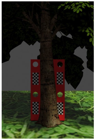 The traditional methods used to calculate trees’ height and wood volume present an error, which is usually up to 10%, or even 15% to 29% for trees 5–10 m high []. To test the accuracy of the algorithms developed, a virtual environment was designed, using the 3D modelling program Blender. In the virtual environment, it is possible to observe the trees in any chosen angle, as well as to create different tree models and know their measures with high precision. Figure 2 shows an example of a virtual tree with a special target behind the stem. In the simulation environment, the point of view was changed and different pictures were taken to debug and test the algorithms.