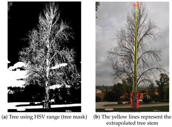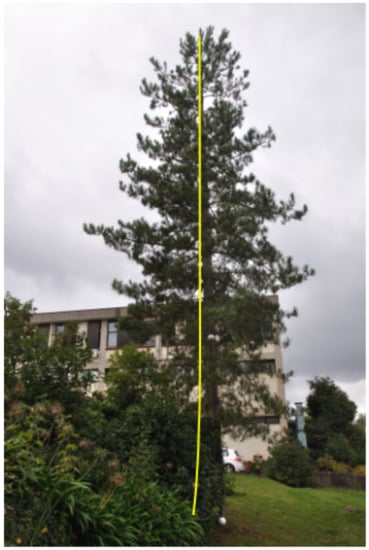 The proportion transformation method was especially developed to estimate the tree height if the image shows the full tree. It is based on the methods used in [,]. The first step of the method is to determine the highest point found in the tree, using image processing methods similar to the ones applied in Section 5.2 for target extraction. The lowest point of the tree image is also detected, using the red target as a guide line to find the tree bottom. The height of the tree in pixels is then calculated, as the distance from the top to the bottom. This distance is then scaled to real world values, using Equation (2). Figure 5 illustrates the concept. Figure 5a shows one image of the tree contrasted against the background. The tree is binarized and the top and bottom points are then easier to find in the binary image. Figure 5b shows the original colour image, but with the yellow lines showing the approximate cone of the tree stem.