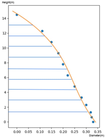 Figure 6 shows a shape function, this plot of the height of the tree stem as a function of the tree diameter of a pine tree with approximately 14.4 m height and a stem that starts at 0.33 m diameter. To determine a shape function, it is necessary to have some reference values, such as the blue dots in the figure. The more dots are given, the higher the chances of calculating a precise shape function. These mathematical functions are known from forest engineering for different tree species [,,]. Hence, with just a few points it is in general possible to determine an approximate shape function with good accuracy.