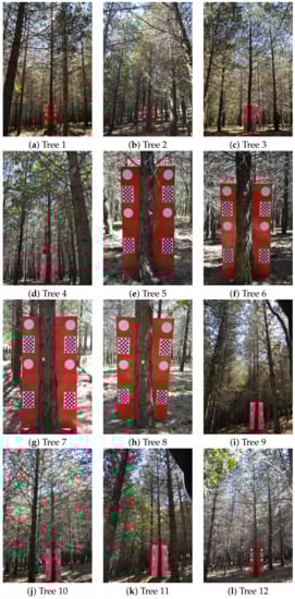 Table 1 and Table 2 show the results obtained with pictures of the 12 real Pinus nigra trees shown in Figure 12.