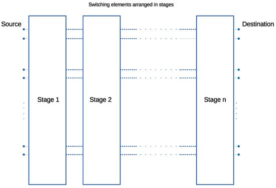 MINs involve switching elements linked in stages between the input and output terminals [] based on a specific topology. Generally, the topology of MIN follows the architecture provided in Figure 1. Switching elements store received packets and forward them using input and output buffers []. Thus, the performances of MINs are greatly affected by the internal buffer design. Each stage partly satisfies the input-output connection requirements []. These stages of switching elements and links provide high-bandwidth and low cost/cost-effective communication among multiprocessors. MINs are suitable for communication between units of processors and memory whose operations are tightly coupled []. They provide fast and efficient communication between processors of high capacity []. The advantages of parallel computing have made MIN a practical way to achieve high-performance computing [].