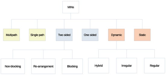 MINs for multiprocessor systems are of different kinds such as Benes, Omega, Clos, Indirect binary cube, to mention a few []. MINs are either single-path or multi-path []. The former is usually not fault-tolerant since there exists only a single path to the destination while the latter is more fault-tolerant because of its multi-path architecture. MINs can also be categorized as static and dynamic. Dynamic MINs can be further classified into three: regular, irregular and hybrid. Regular dynamic MINs usually have the same number of switching elements in every stage while this is not the case in irregular MINs. Hybrid MINs combine the features of regular and irregular MINs []. A summary of these categorizations is given in Figure 2.