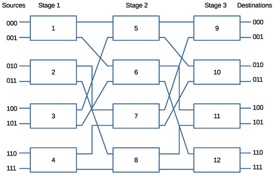 SEN is a basic topology of MINs having N inputs and N outputs []. Figure 3 shows an example of 12 switching elements linked in three stages based on SEN topology. Note that several other topologies exist in the literature such as omega, gamma, delta, and hypercube. The configuration of SEN is dependent on its switches, number of stages, and its network interconnection []. An N × N MIN that is connected to switching elements (2 × 2 crossbar switches) forms a structure with switching elements in every stage and a total of stages. However, there is only one single path between the source (input) and the destination (output) []. SEN is considered a unipath MIN having the lowest cost [] and can be enhanced in several ways to suit the reliability and routing requirements. SENs are thus considered highly propitious for the design of efficient and reliable supercomputers []. One way that has been used to improve the performance of SENs is increasing the number/size of switching elements to increase its redundant paths thereby improving the network performance [].