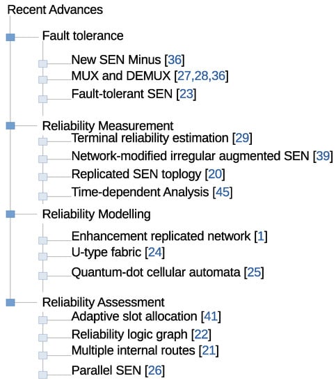 A lot of researchers have invested much time and effort to improve this network in terms of reliability and fault tolerance []. This is because these two properties are of major concern in the design of SEN’s variants. Next, we discuss some of the pertinent aspects of fault tolerance and reliability with a highlight of the recent advances towards achieving these objectives. A classification (Figure 4) and comparison of metrics, objectives and unique features (Table 1) of some of these works are presented to provide a first look into some of the features and limitations of these works.