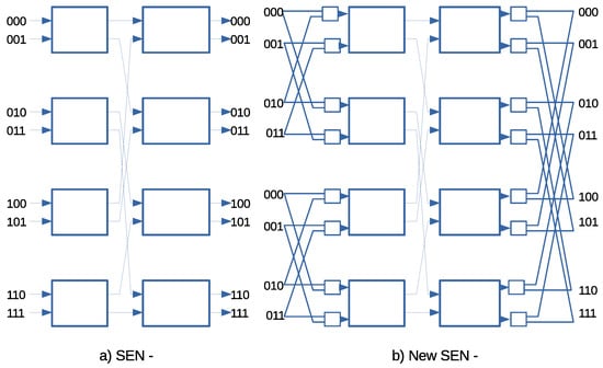 Similarly, Gholizadeh et al. [] proposed a new technique to enhance the reliability of fault-tolerant MIN based on shuffle exchange and shuffle exchange gamma interconnection. This was achieved by adding more MUX and DEMUX to the first and last stages to increase the number of paths. This in turn increases the reliability of the system. Interestingly, by adding these extra modules, a bypass path is created for the source or destination node which reduces the problem of single-point failure. The proposed scheme shows promising results with respect to reliability. However, this is traded-off with cost. Since prior works achieve only one fault tolerance at the input/output stage, Ref. [] proposed fault-tolerant SEN- (Figure 6) to address the issue of fault tolerance with a higher number of fully disjoint paths. A throughput comparison of two-terminal reliability assured that the proposed scheme provides better reliability.