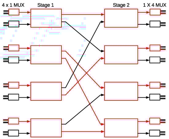 As shown in Figure 5, the use of multiplexer (MUX) and demultiplexer (DEMUX) was considered in [] to achieve full connectivity by providing disjoint paths between the source and the destination. The architecture achieves fault tolerance because the source-destination paths have two paths in between them. Additionally, there is a lower path distance compared to other SEN variants considered and there are distinct paths for reliability enhancements. The key advantage in deploying this approach is the provision of redundancy as there are totally disjoint source-destination paths. According to the authors, the use of MUX and DEMUX at the input and output stages is beneficial with respect to reliability, delay and cost despite that it requires one stage of switching element.