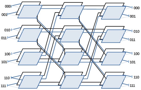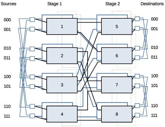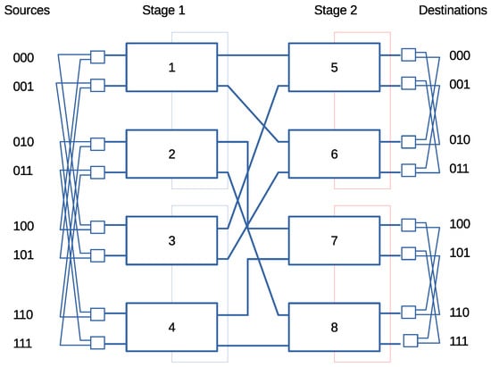 Some enhancements in reliability can be achieved by adding more MIN stages which increases the distinct source-destination path. However, this approach increases cost and network complexity. Additionally, multiplexer and demultiplexer can be used to improve the network since several MINs can be arranged and connected in a parallel manner. However, the cost and failure rate increase as switching becomes more complex. Another approach is that the network can be replicated over-and-over again so that multiple paths are created between source and destination pairs. This makes its reliability higher than a MIN with a single path. However, the cost, as well as path length, increases []. Nevertheless, replicated MINs are suitable for multi-casting at higher reliability [].