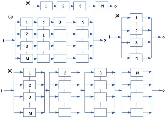 Typical examples of RBD are shown in Figure 8 (adapted from []) where connector lines join blocks that represent system components. The input and output of the network are located at different ends and each system functions properly only if a minimum of a single path having functional components between source and destination exists. In Figure 8a, none of the components should dysfunction in order to make the entire system functional. Figure 8b–d show series-parallel arrangements with active redundancy. In Figure 8b, all the redundant components are arranged in parallel whereas in Figure 8c,d a combination of series-parallel connections is considered. To achieve active redundancy in such configurations, it should be borne in mind that the links in parallel provide redundancy and as such should remain active [].
