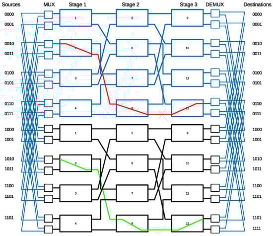 Abedin et al. [] also proposed a parallel SEN (PSEN) architecture (Figure 11) where the terminal, network and broadcast reliabilities of SENs are enhanced. The proposed architecture is also used as a framework where SENs with one and two extra stages are plugged in. In Figure 11, the green line (below) indicates a non-faulty path which provides redundancy for the red colored path (above). With the use of RBD, the authors showed that the performance of the proposed method is better than SEN in terms of of reliability and cost-effectiveness compared to other forms of MIN. They also concluded that parallelizing SENs improves the performance as compared to adding more stages to the traditional SEN architecture.